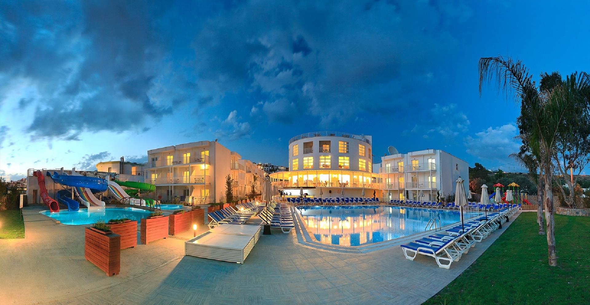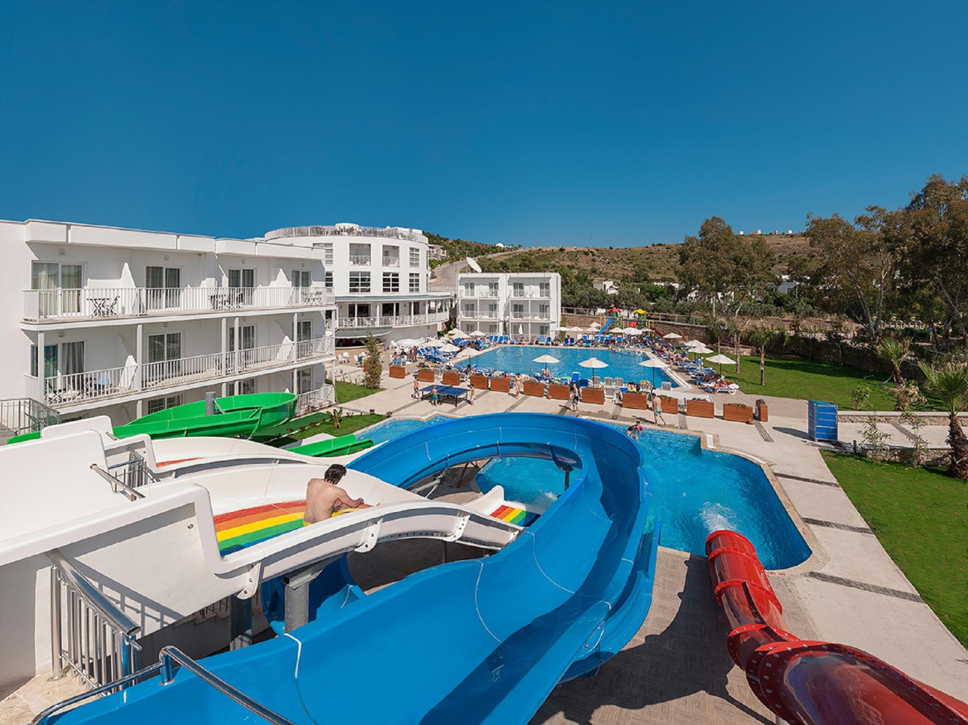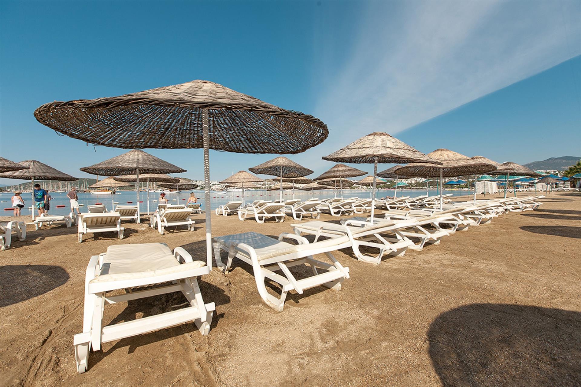 Our personnel, specially trained to give you all that is expected of an unforgettable holiday, promise you tranquility, fun, happiness and comfort. You can bask in the sun and relax in our private beach only 100 meters away from the hotel.Our hotel has a modern design consisting of a main, and 11 separate buildings, offering you two alternatives for 4-star comfort:• Standard Room Standard rooms with a maximum occupancy of three guests offer a double bed or two single beds, and an extra folding bed on request. Features include parquet floors, bathroom, LCD TV, mini bar (water at check-in), direct dial phone (at charge), split system air conditioning, balcony, and safe box (at charge).• Large RoomSpacious rooms with a maximum occupancy of four guests offer a double bed or two single beds, and a bunk bed. Features include parquet floors, bathroom, LCD TV, mini bar (water at check-in), direct dial phone (at charge), split system air conditioning, balcony, and safe box (at charge).