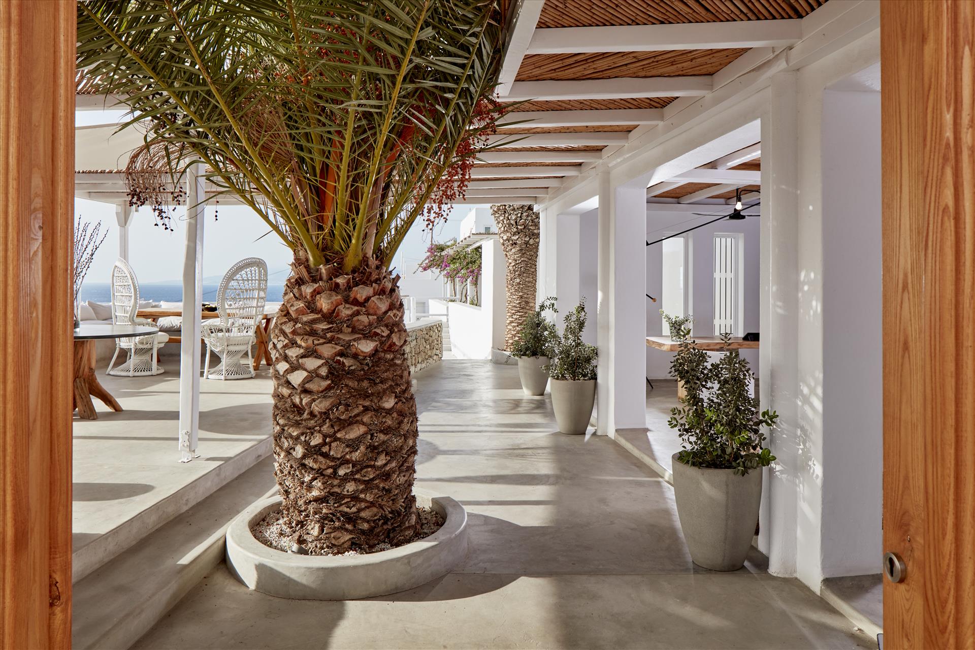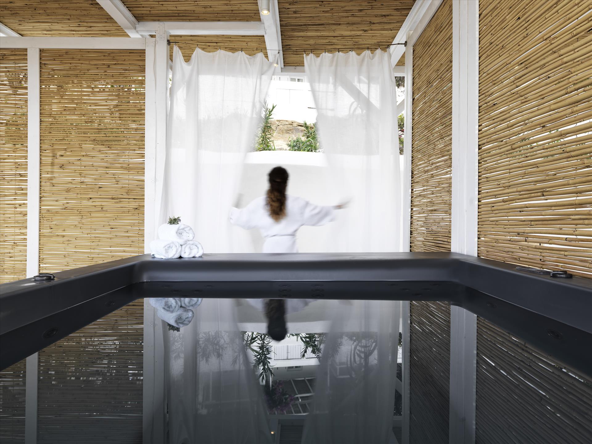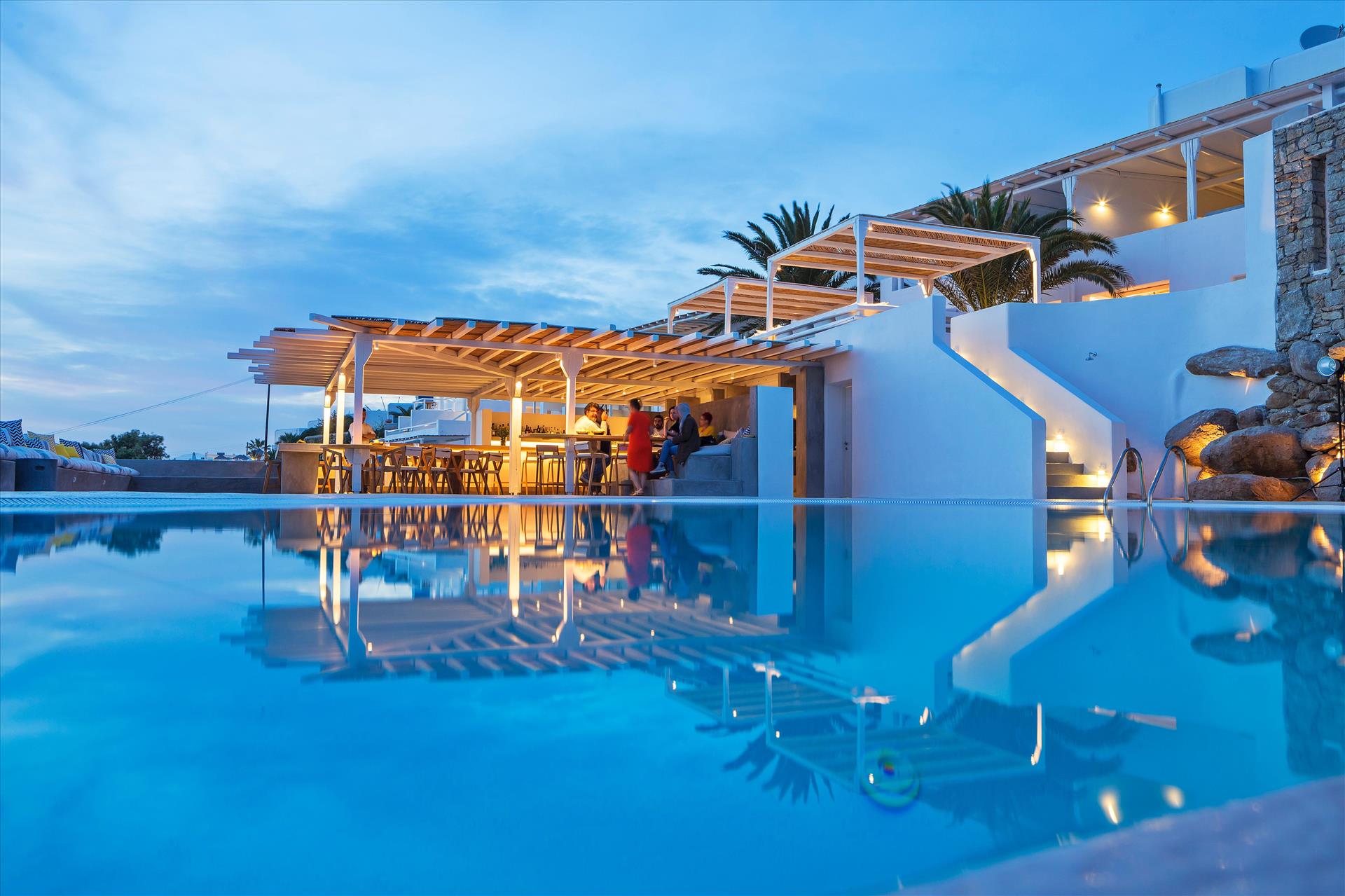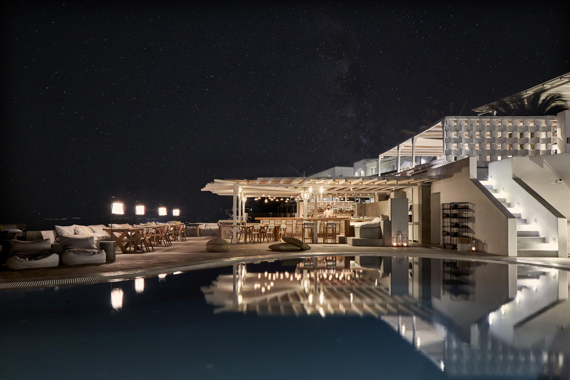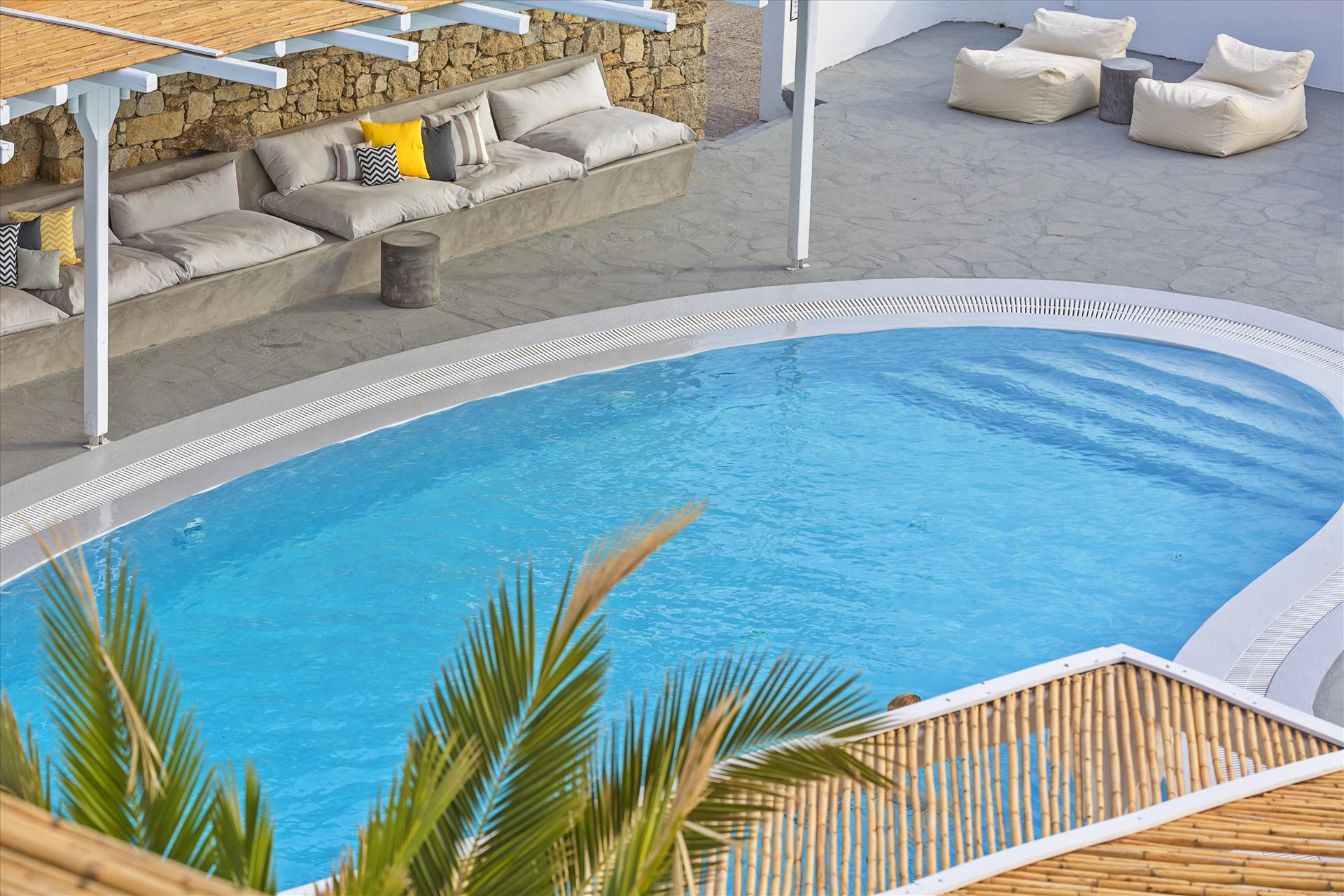 Beautiful location looking northwest onto the sea: a perfect view. The Junior Honeymoon Suite is excellent; it has private patio with a hot tub. I don't have much experience with luxury hotels, but this place seemed quite luxurious to me. The staff is very friendly and happy to help with anything you may need. It's a 5 minute drive from the airport, and overall, good value for money. I can think of only two drawbacks: the tap water isn't potable, and there could stand to me more free bottled water in the rooms. Also, the on-site restaurant is not worth the prices --> food is good, but not outstanding. Your best bet is to eat the provided breakfast (it's quite good) and then go into town for lunch and dinner. The "Little Venice" neighborhood is only a 5 minute walk from the hotel, and the food options there are incredible and affordable. All things considered, this is a great choice for a stay in Mykonos, and I would definitely go back :)