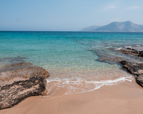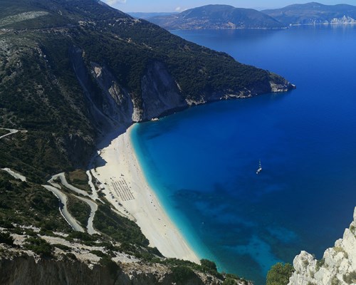 Set in a secluded cove, this stunning islet can be reached in ten minutes by boat or water taxi from Zola, followed by a short hike to its ice-white dunes. The photogenic bay of Fteri offers an incredible backdrop and electric blue waters which are perfect for diving, although it's best to bring water shoes to protect your feet from the rough pebbles on the seabed! Escape the hustle and bustle of everyday life and relax on Kefalonia's most beautiful beach.