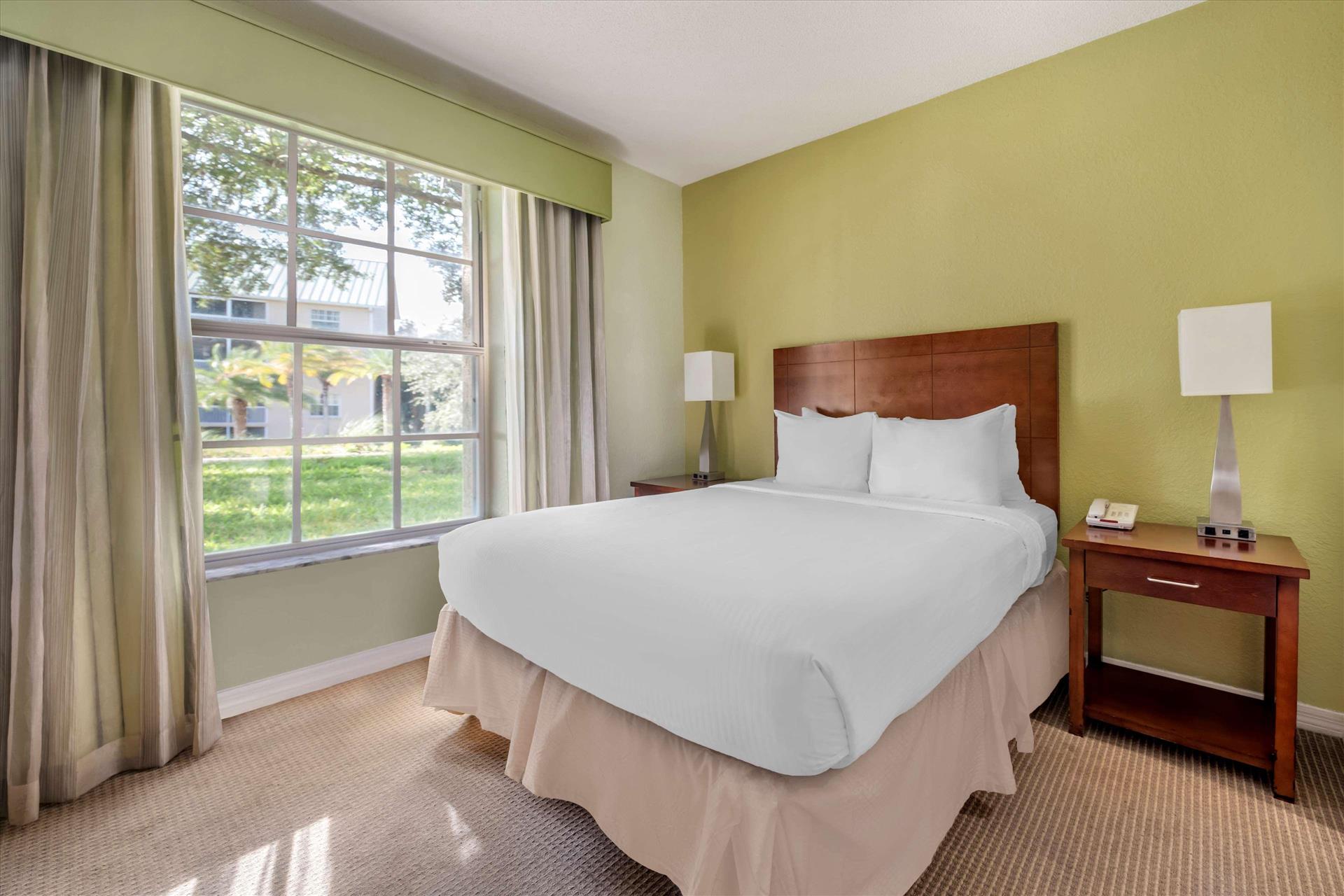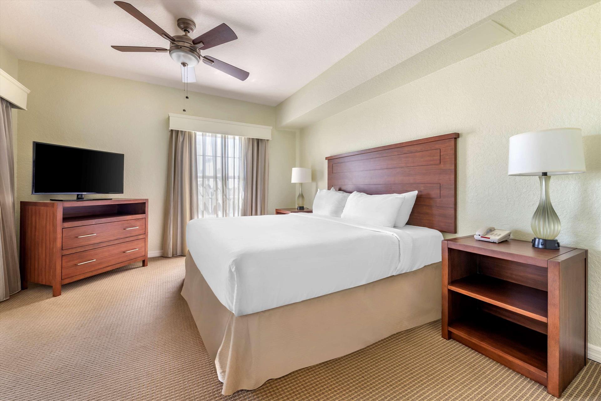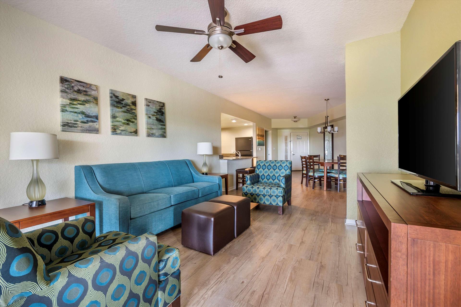 Daily Resort Charge includes: Guest internet access; mini golf; sports equipment including tennis, basketball, shuffleboard and ping-pong; bicycle rentals; use of gaming consoles; select daily activities; TV streaming & casting; PressReader access. Discover the perfect family getaway at Hilton Vacation Club Mystic Dunes in scenic Celebration. Our resort is tucked among 600 acres of rolling hills; lush Florida nature preserves and the emerald greens and fairways of our championship golf course. Conveniently located just five miles from the entrance to Walt Disney World and seven miles from Celebration Town Center. On-site amenities include four heated pools, mini golf, a full-service restaurant, fitness center, and children's activity center. Rest well after a fun day in our comfortable one- to three- bedroom suites, with kitchenette or fully equipped kitchen.