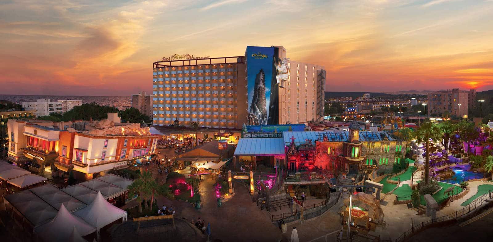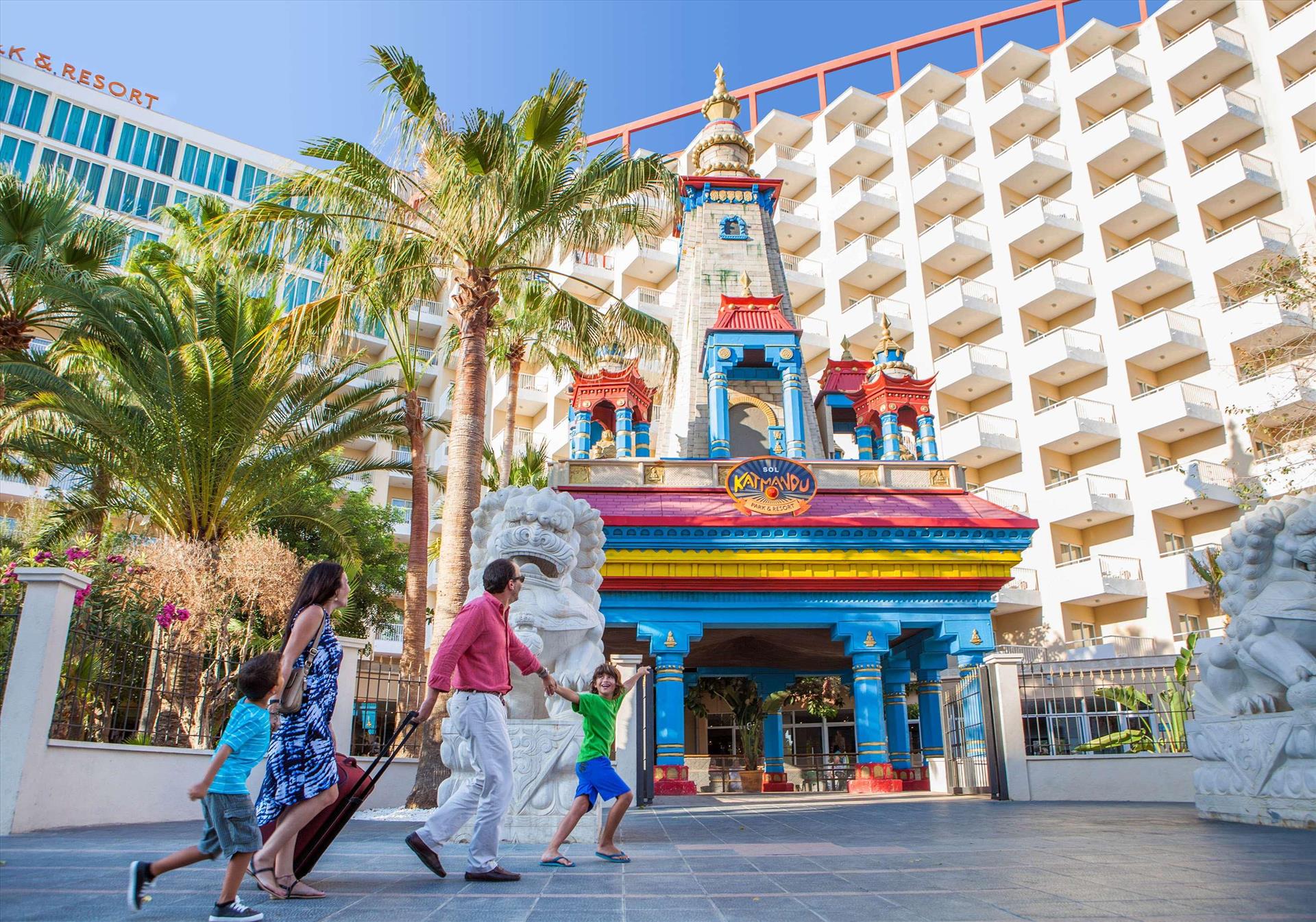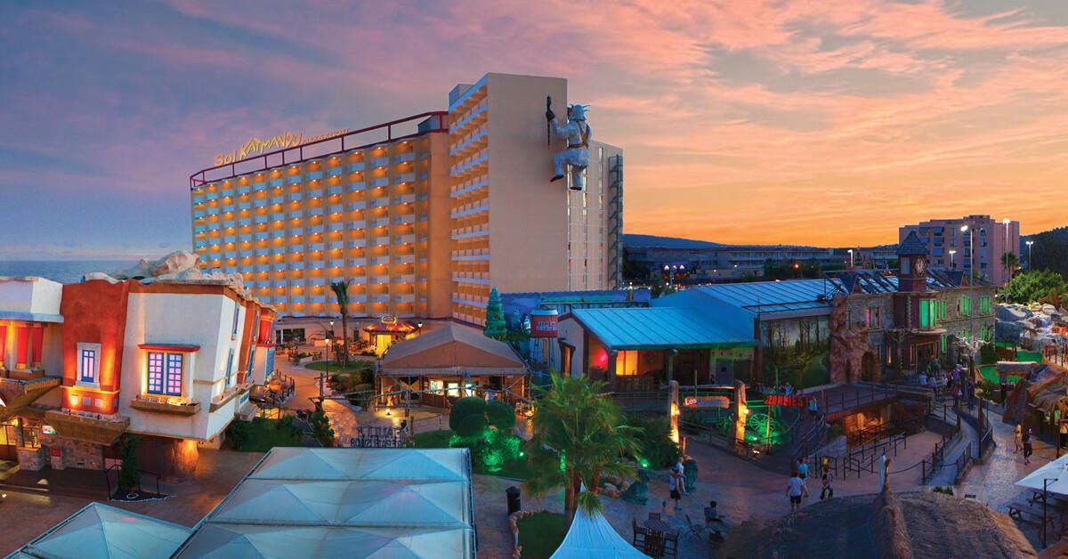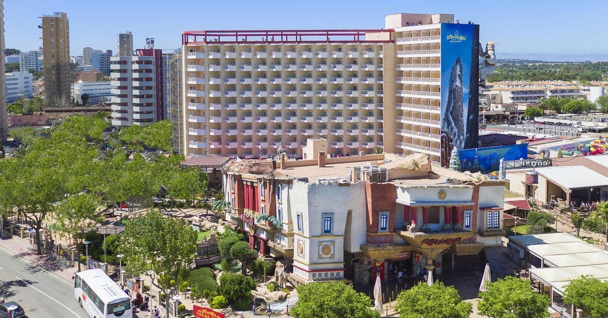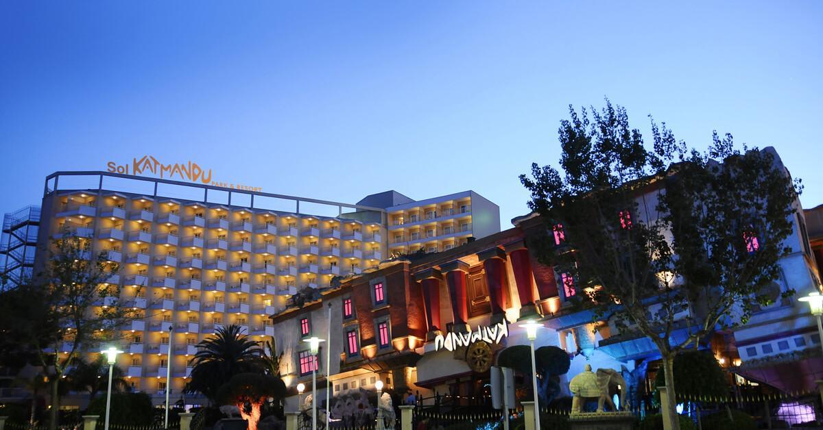 Sol by Meliá presents Katmandu Park & Resort, the first “fun-inclusive” hotel in Majorca, perfect for families and friends, with both accommodation and entertainment all right in the middle of theme park fun and just 250 m from the maginficent sandy beach. Included with stay is free entry to the fun and thrills of Katmandu Park. Among other services and facilities, the hotel provides free Wi-Fi throughout, 3 outdoor pools with sun beds. Buffet Restaurant (All Inclusive option). The rooms are comfortable and are fully equipped. The hotel offers full programme of funny and creative activities for kids in the mini club Kamp Katakidu (8 months-12 years) during the day and a varied entertainment programme in the evening with live music, shows and much fun for all ages. Come and discover the history of Katmandú Park! Pets not allowed.